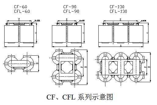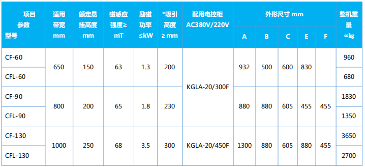 四、CF、CFL系列懸掛式電磁除鐵器主要技術(shù)參數(shù)、外形尺寸