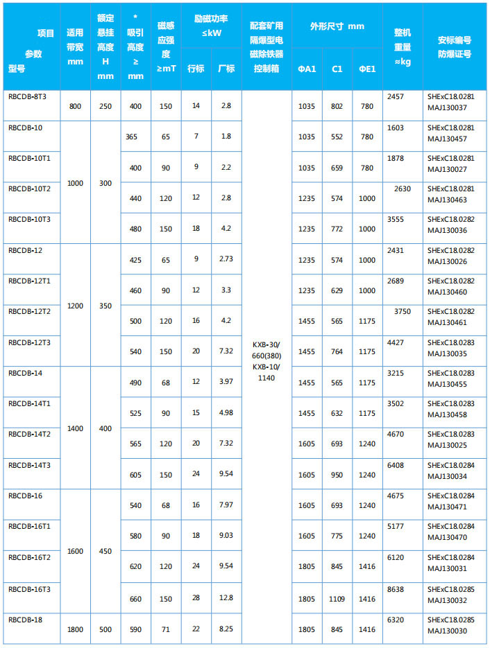 四、RBCDB系列隔爆型盤式電磁除鐵器主要技術(shù)參數(shù)、外形尺寸 執(zhí)行標準:GB3836-2010、Q/321191ACL003