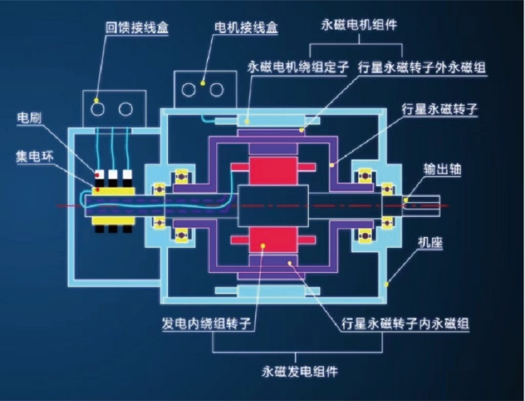 多功能雙永磁調速一體機是永磁電動機與永磁發電機嵌套集成的多功能電機。主要由內繞組轉子、內外雙永磁行星轉子及電機定子繞組組成,其中內繞組轉子是輸出軸,永磁行星轉子的外永磁體與電機定子繞組電磁耦合形成永磁電機;內繞組轉子與永磁行星轉子的內永磁體電磁耦合形成發電機,控制內繞組中的感生電流的大小控制轉子的輸出轉矩與轉速。并將內繞組中多余能量通過集電環回饋至電網再利用。